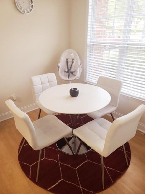 I got this in red and it adds a nice pop of color to my breakfast area.o have a 4 seat cafe table and I got the 5 foot round.