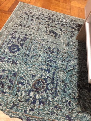 This is a very nice rug, but it looks brighter/more vibrant in the online picture than in does in person. It also looks more faded. I still like the rug and would recommend it. I purchased the light blue color for reference.