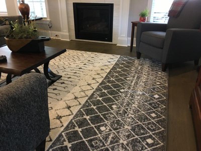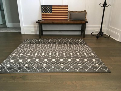 For comparison, this solid DARK grey option is the same coloration as the Moroccan Trellis grey/ivory option. The solid dark grey has no "frosting" effect, but matches otherwise. At the price point, these rugs are durable, soft, and easy care.
