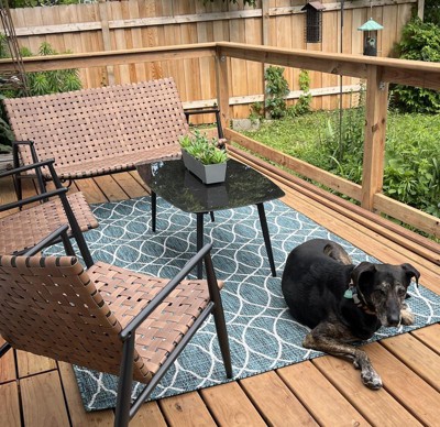 5x7 perfect size on our deck with 4-pc patio set Pattern looks like reflections on water- perfect for waterside locations or bringing a bit of dark blue water to your yard