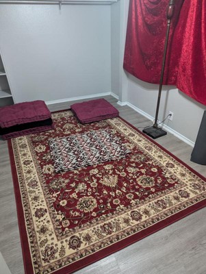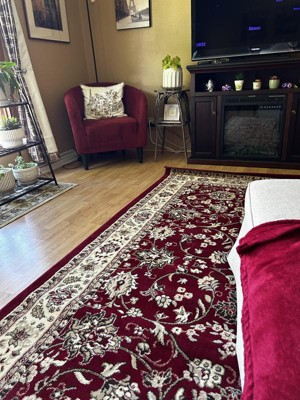 I am thrilled with this purchase. The rug has rich vibrant color and it’s heavy enough to lie flat just a day after rolling it out. Yes there was minor curling at the four corners but that settled down after another day or so. I absolutely recommend this rug - the color is a true red (no orange or magenta hues) and the accent colors are brown and off white. Excellent quality. So happy I also got the matching runner. My living room was majorly upgraded with these two items!!