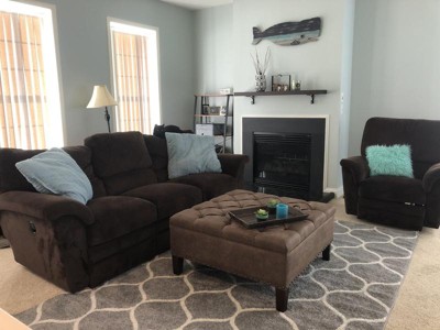 My living room was missing a focal point. I wasn’t sure if a rug over carpet would work but honestly, I’m in love. This rug has a modern feel and really helps to define the living area.