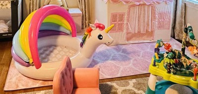 I got this rug to put on my living room so my baby could play on it and I could make a play space for her and it look super cute. It’s light pink and it goes with everything. Happy with purchase.