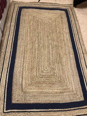 [This review was collected as part of a promotion.] This 5×8 rug is a perfect option for a kitchen table or outdoor covered sunroom/patio. Is it is made of mostly jute that makes it very durable and sturdy. It does have imperfections along the border because it is hand woven but this adds to the elegance of this rug. It is a very natural and simple navy blue border pattern that can match with lots of different furniture and decor.