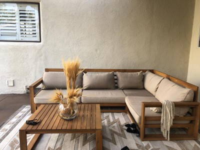 I’ve been looking at area rugs for inside my living room for about 2 months! I was trying to find the perfect wood brown/grey color that matched my theme but nothing I liked. I saw this and fell in love but was super nervous about buying it for the inside of the house. The stitched toupe ish color you can tell is more outside material but it’s still very soft and the rug as a whole is very very soft to walk on or sit on even. No regrets at all with using it as an indoor rug! Plus we have dogs and this makes it super easier to vacuum!