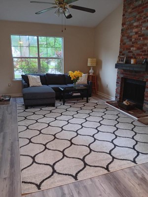 I went with the 8x11 after trying several different sizes and versions of their lattice rugs. It's really gorgeous and settled well. It may look discolored in photos but it's not, just the lighting. Note the larger size has notably darker gray piping than the smaller size which was a bit of a bummer but still works. Also note it's beiger/oatmeal in person compared to the white of photos. Pile is slightly less plush than the hexagonal lattice pattern but still great. Very satisfied and many thanks to this company for all their time and patience with me as I tried different options and shipped several back. They're truly superior on that front and it's why I keep coming back to them. This is my third rug with them. Totally opens up my room and emphasizes its fantastic size.