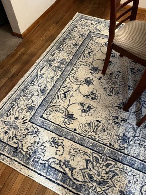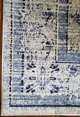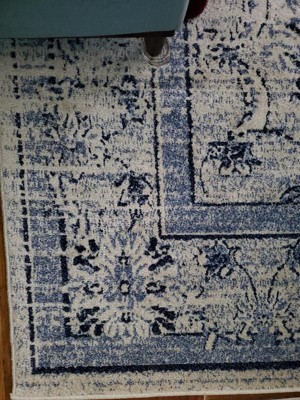 This rug is very cushy and nice quality. It is a brighter blue than I was anticipating especially because it is also a very white background.