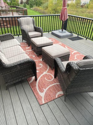 • EASY CARE: For an outdoor rug, remove debris frequently with the use of a broom or blower. To wash, spray the surface with a soap and water mixture, then rinse thoroughly with a garden hose and hang over a railing to dry thoroughly. Rotate for even wear.