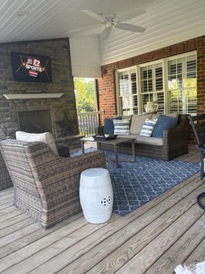 This rug looks great on my outdoor porch. Love the various blues and the texture. Hoping it will last many years.