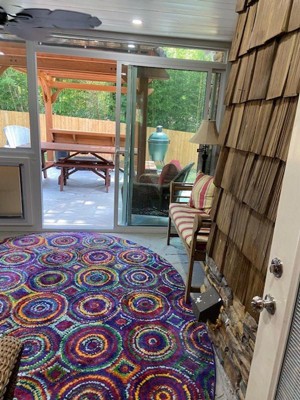 I bought this rug for a newly enclosed back porch. The oval rug fits the floor space pefectly, and the psychedelic colors and design contribute to a cozy gathering place. I love it!