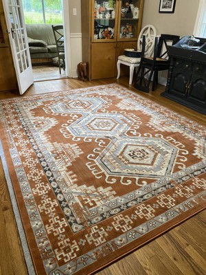Rug is beautiful, but not as vibrant and orange as appeared online. Definitely muted brownish orange and light blue colored instead of orange and grey. Sadly it was returned.