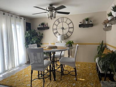 Guests appreciate the rug for its vibrant colors, quality, and cozy feel. It fits well in various spaces like solariums, kitchens, and bedrooms. While the rug is generally well-received for its appearance and thickness, some guests noted it isn't as soft as expected. The rug's pattern and initial smell were also mentioned but did not significantly detract from overall satisfaction.