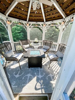 Who knew that they even made octagon rugs like this?! This rug fits perfectly in my gazebo! The gray is the perfect shade- not too light and not too dark. It matches my weathered wood and gray furniture very well. It’s an outdoor rug so I won’t have to worry if it gets wet but it still feels nice on your feet. It’s just the right amount of coastal for by my pool without being tacky. Love it!