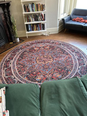 We love our round rug! It ties the room together and colors are vibrant. It definitely needs a no slip pad underneath.