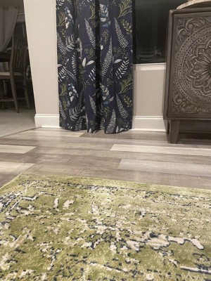 I must have looked at 20 green rugs online and finally went with this one because it had some navy throughout. I was worried it would be too “neon” but it’s not, it’s very pretty! Love it in our coastal home. It’s well made, so soft, and does not show pet hair! It comes rolled backwards which helps with it laying out well. I had to put some heavy items around a few edges for the first night but then it was excellent.