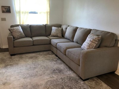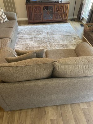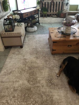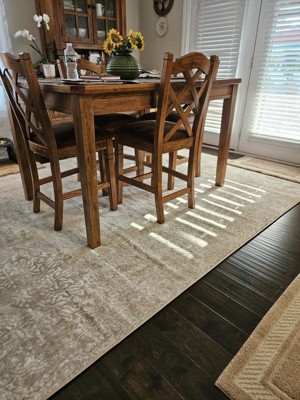 We bought this recently for our great room. We didn't want to spend a lot as our dog sometimes makes messes! The rug looks nice, though it is quite thin and some of the bumps have not flattened completely. The beige color is sort of grayish beige, so it complements our couch, chairs and floor.