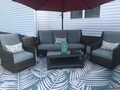 Beautiful ocean blue and white rug. Just like it's pictured. Makes outdoor area very inviting and complete.