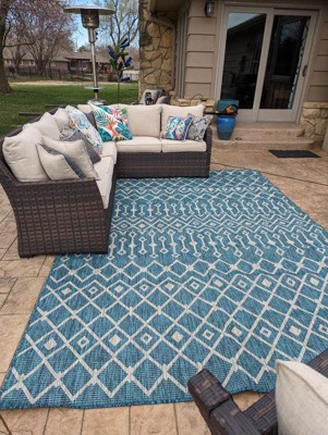 Nice outdoor rug! The teal color is true to what you see on the website and it feels comfy in bare feet. It’s not plush like a indoor carpet but perfect for outside because we have two dogs and it’s easy to clean. Shipping was super fast too!