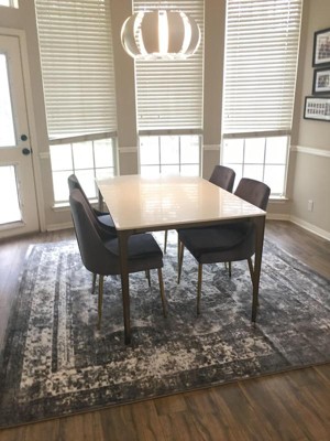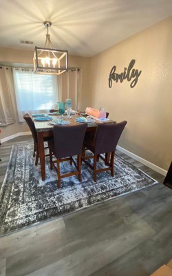 This was the final purchase for my pandemic-inspired kitchen refresh, and it truly pulled the dining nook together. White table; gray chairs; I took a chance on the grays working well together, and they did as there are many shades of gray in the rug. The size was perfect too, the chairs stay on the rug when pulled out, plenty of coverage. This was a great choice at a great price!
