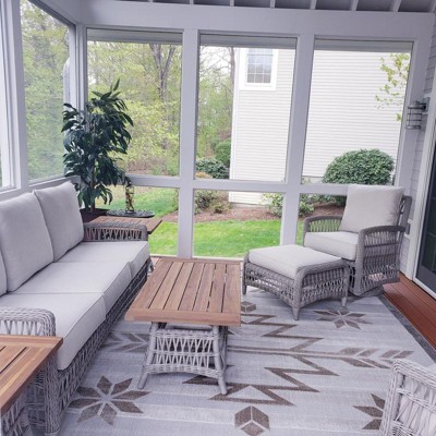 I bought this rug a month ago. It goes perfectly with our new outdoor furniture and has a great feel and texture to it. It could also be used as an indoor rug if a pad is added. The only reason I didn't give this rug five stars is that there are some snags (maybe 3 or 4) that were noticeable to me. I didn't want to return it for a replacement since I didn't know if this is typical of outdoor rugs. Mostly, the furniture covers them and I'm very picky so, I'm probably the only one who really noticed them. Otherwise, it's a beautiful rug that adds so much sophistication to the room with its neutral palate and enhances the beauty of the room. Everyone comments on how beautiful it looks on our three-season screened-in porch with our new porch furniture. Living in New England, we spend Spring through Fall out there.