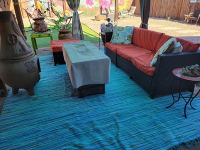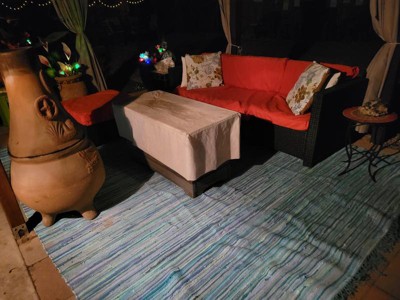 This rug is absolutely gorgeous and looks great on my patio with all of my colorful furniture!