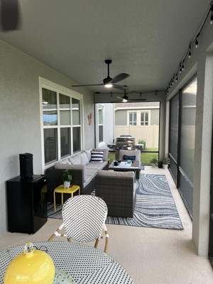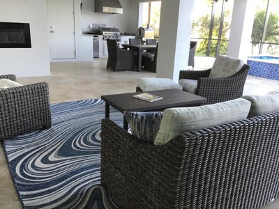 Love the contemporary look of this rug! We are so happy we chose this to accent the blue of our pool with our living area on our lanai. We still are going to add a few more pillows but love the rug to add color.