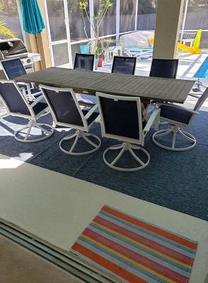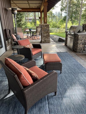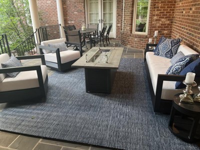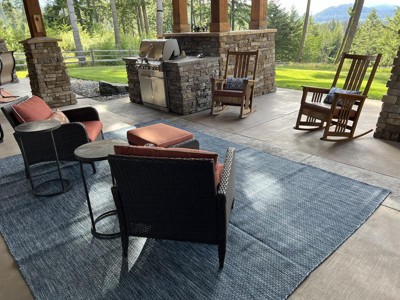 This beautiful blue rug fits perfectly under my dining table on my patio. Well done!