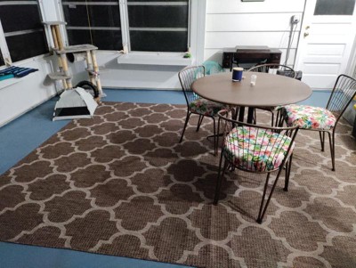 The rug came very well packaged and once unrolled transformed our weather-worn wooden deck. The lattice pattern is very attractive and the soft brown color enhances the silvered color of the wood in our outdoor space. We are looking forward to a summer season with a fresh new look!