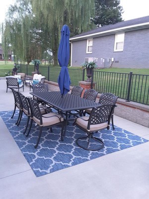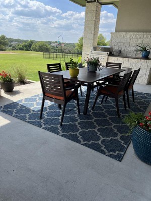 This Navy Blue Lattice Rug was the perfect highlight for our patio. The shipping folds relaxed within an hour and fit perfectly on our patio. Received many complements and gladly shared your website with all!