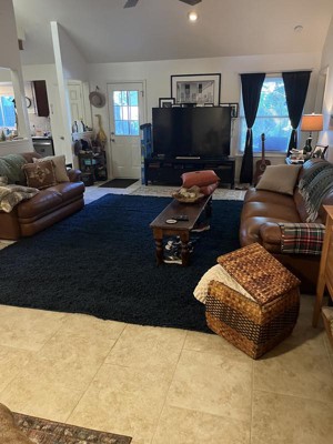 The rug arrived in new condition, well wrapped and looked just like the picture. This is a rich blue rug not as dark as navy, but on the way. It looks great against the walnut brown couches and is even fluffier after a vacuum!