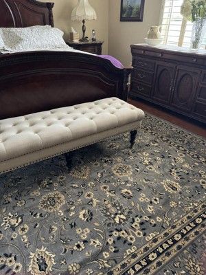 Beautiful Rug that makes our bedroom just a little more elegant! I wish it was just a tad thicker, but it is under our heavy bed and won’t slide anyway. I would recommend this rug to anyone who lives greys, tans and hint of blue!