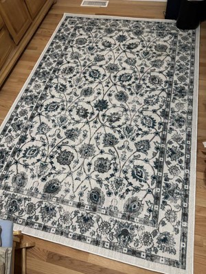 [This review was collected as part of a promotion.] This Unique Loom Aarhus Collection area rug has received so many compliments. The floral design with colors of ivory black and blue complement any decor. It lays flat, no upturned corners to trip over. A generous 5'1"× 7'10" is the perfect size for my family room. It's soft to the touch, both hands and feet, as my great grandson likes to sit on it to play. Vacuuming is a breeze, easily picks up, without the beater brush. Quality made, looking forward to using it for years to come.