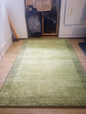 The rug does not look much like the photo in the listing. In stead of green with a dark green line around it, it’s green with a white line around it. Also, it is thin, but I was expecting that from the price and was going to put it over carpet anyways. Luckily I was able to return it very easily.