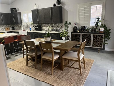 This rug is a beautiful addition to any space, offering a lovely natural color and texture that enhances decor. Guests appreciate its durability, making it suitable for homes with pets, while its substantial weave provides comfort underfoot. However, some guests have noted issues with uneven edges and curling corners. Overall, it is a stylish and functional choice for various rooms, from dining areas to entryways.