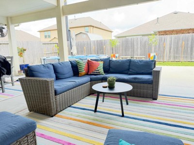 We purchased two striped 9x12 Aruba rugs in gray for our covered patio in late March 2025. We loved these rugs for the first couple months, but by mid-summer the pink was completely bleached from the sun and turned a baby blue color. Mind you, this is a covered east-facing patio that only gets a few hours of morning sun. Outdoor rugs definitely fade over time, so we weren’t expecting them to stay pristine, but it’s wild how quickly the pink went. I wouldn’t purchased them again knowing what I know now.