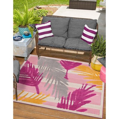 Relax by the pool or refresh with a cool drink on the deck or patio with the lush and refreshingly vibrant coloration and patterns of the Aruba Outdoor Collection. With an abundant choice of styles, from stripes and geometric patterns of dots, diamonds or ovals, there's sure to be a design to create a picture-perfect outdoor living space. Choose from several botanical styles including sweeping graphic palms or elegant large-format silhouette style floral patterns for a more refined look. There's even Aztec-style patterns for a bolder look. Vibrant pastels of pink, peach and purple are complemented by natural earth tones of navy, gray and rust. Available in a variety of sizes from runners to circles, squares and rectangles, each rug is made of machine woven, power loomed space dyed polyester. This medium pile construction offers a unique high/low pile with a combination of cut pile and flat weave technique, giving it extra dimension and visual interest. Enjoy it for both indoor and outdoor placement.
