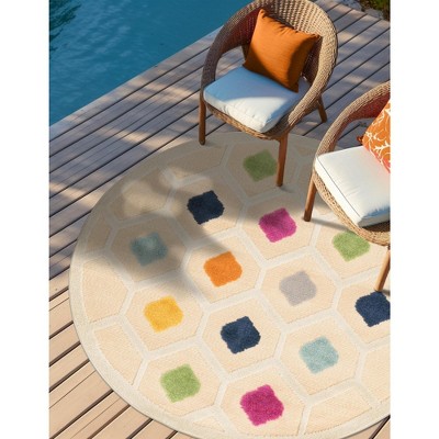 Relax by the pool or refresh with a cool drink on the deck or patio with the lush and refreshingly vibrant coloration and patterns of the Aruba Outdoor Collection. With an abundant choice of styles, from stripes and geometric patterns of dots, diamonds or ovals, there's sure to be a design to create a picture-perfect outdoor living space. Choose from several botanical styles including sweeping graphic palms or elegant large-format silhouette style floral patterns for a more refined look. There's even Aztec-style patterns for a bolder look. Vibrant pastels of pink, peach and purple are complemented by natural earth tones of navy, gray and rust. Available in a variety of sizes from runners to circles, squares and rectangles, each rug is made of machine woven, power loomed space dyed polyester. This medium pile construction offers a unique high/low pile with a combination of cut pile and flat weave technique, giving it extra dimension and visual interest. Enjoy it for both indoor and outdoor placement.