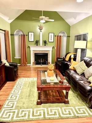 This rug looks great in our living room! It's soft, good quality, and fits the space perfectly. The green is true to color and looks just like the pictures. A great rug if you're looking for something simple that still has some character.