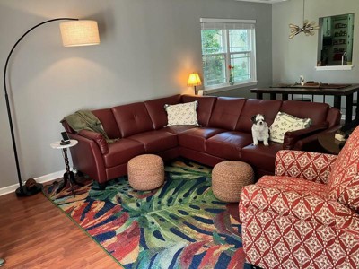 This rug is a stunning addition to any outdoor space, offering vibrant colors and a beautiful tropical pattern that enhances the ambiance. Guests appreciate its durability and quality, making it perfect for patios and decks. While it is more like a mat than a plush rug, it provides a warm and inviting atmosphere. Many guests have received compliments on its appearance, making it a worthwhile investment for enhancing outdoor areas.