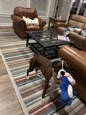 A: The rug is made from 100% polypropylene, ensuring durability and resistance to stains.