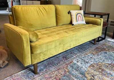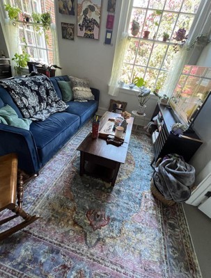 This rug is vibrant and beautiful, my photos don’t even do it justice. The colors change in different lighting and from different angles, which is really cool and makes it versatile for our living room color palette. It’s also a very soft fabric and my cats are loving it.