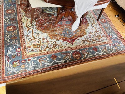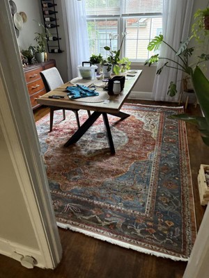 I wasn’t sure how I’d like this rug because I couldn’t tell how light or dark it was on the pictures. It’s sort of in between and has positively transformed my dining room. I love it. Please ignore my mess in the photo. I have not gotten rid of stuff yet. Totally redecorating.