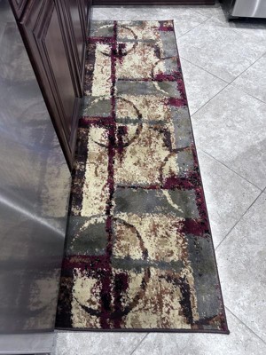 I got this rug as a runner to match the rectangular rug of same design in my entry. It is in front of the wet bar which consists of distressed green color. The many colors would make it fit in with a lot of decor colors since I also have accented with burgundy. Great quality and plush to all on. Only con is the amount of time it took to lay flat but a minor problem for the price/quality ratio.
