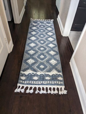 [This review was collected as part of a promotion.] This rug is so pretty & it was longer than what I thought it was. I love the tassel at the end, you can tell they are made out of really good material, I should say the whole rug looks that way. It's really soft to walk on & the blue/ ivory are just a great combine of colors