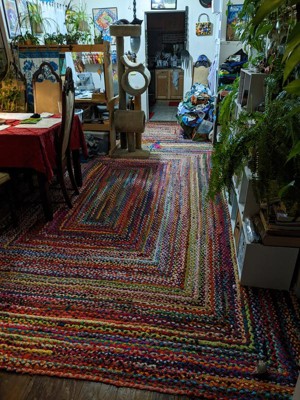 I bought this braided rug as a 5x7 for under my dining room table > 3 years ago< It did so great and held up so amazingly to everyday wear and tear that I decided to put it in the smaller section of this room and buy the full size 10x14 wall to wall so now they are 'sister rugs' and you can't tell which ones new and which one isn't !!! these rugs are the best !!! they're so amazing, they light up the room ! I have the blue and natural color braided rug in my bedroom and it's just so beautiful I very, very highly recommend !!! I can't recommend these rugs enough! (one thing we did do is take U nails and nail down the edge so it would stay in place and not curl or catch in doorways)
