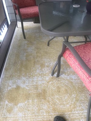 This rug is more orange than yellow the stock picture taken from above (with no furniture) is the most accurate picture of the color. When it is in the sun it does appear lighter but I would still say that its a pretty dark yellow. I included picture of the carpet in comparison with a truly yellow pillow so you can see the real color in comparison. I still love it and it ties in the different yellows of my painting so I am happy with it. I am giving it four stars because its not 100% symmetrical... on corner is shorter than the other corner which causes the carpet so seem like its not lined up correctly. It's only minor and i think only I cna notice, but I included a picture with an arrow pointing to it. It was definitely worth the price! (got it for $99 during 4th of july sale!)