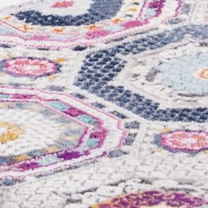 A: The rug showcases traditional geometric designs in bright, multicolored fibers for a vibrant look.