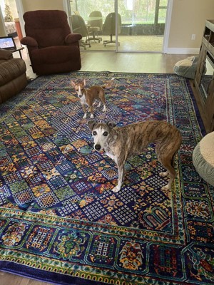 I love my new rug. As stated in the title. It is reminiscent of Mexican Talavera tiles. My only criticism is the color of the picture looks greener where the rug is more primary blues and yellow. Not a deal breaker though.