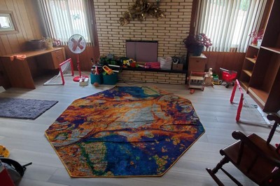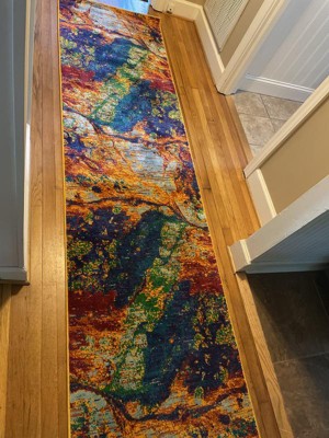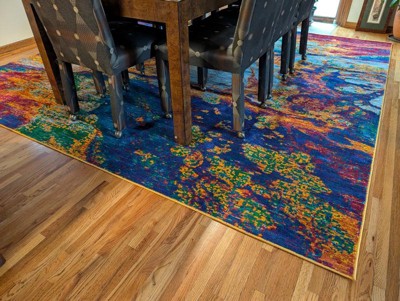 A: The rug features abstract patterns and bright, psychedelic colors, ideal for making a bold statement.