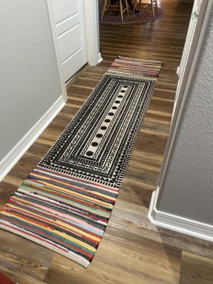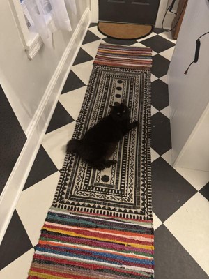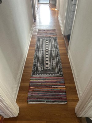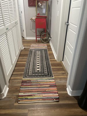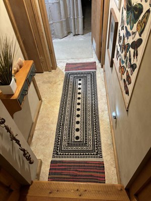 I'm happy with the rug, it's a good fit for the space and I love that it's a little different. What I couldn't tell from the photos and I wish that I knew is that the black is printed/painted on beige part of rug. It's like a rag rug but all beige with the black printed on. I wish the black was the fabric so I won't have to worry about it chipping in places. The center part is also not as soft as the outside colorful edges.